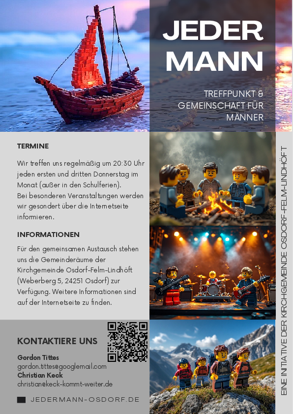 „JederMann“ ist eine Initiative, um einen Treffpunkt und eine Gemeinschaft für Männer in Osdorf und Umgebung zu schaffen. Alle Männer ab 18 Jahren sind herzlich willkommen, teilzunehmen. Es gibt kein vorgegebenes Programm oder Themen. Jeder kann Ideen einbringen. Die Gruppe ist ein Ort gegenseitigen Vertrauens. Alles Gesagte bleibt in dieser Gruppe. Wir treffen uns in den Gemeinderäumen der Kirchgemeinde Osdorf-Felm-Lindhöft.